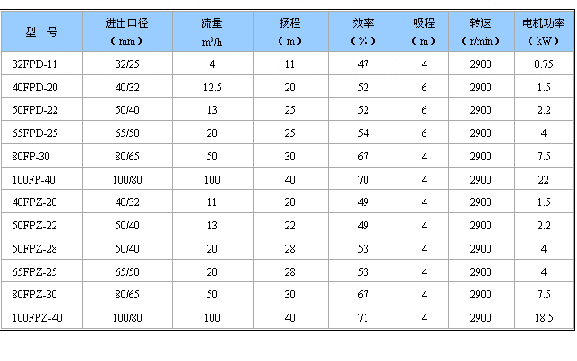 三、FPZ耐腐蝕自吸離心泵性能參數(shù)表: