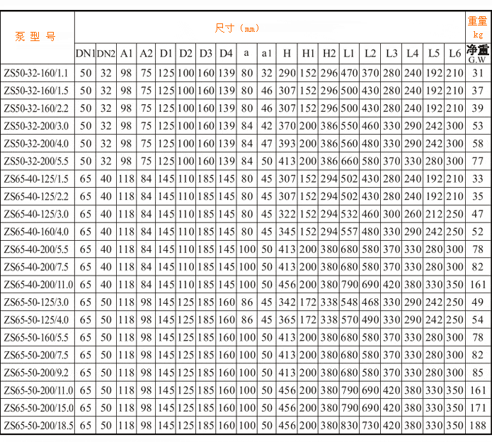 ZS型不銹鋼沖壓離心泵尺寸表